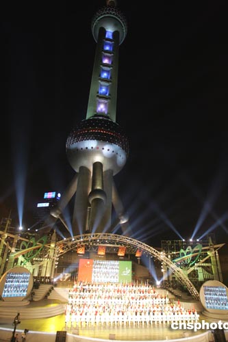 開幕式會場借助東方明珠塔十一個圓球與乒乓球十一分計分制的天然巧合,體現(xiàn)了“大珠小珠落玉盤”的美好意境。儀式結(jié)束后,一千一百八十名演員參與的《乒壇暢想》慶典文藝演出,用歌舞、武術(shù)、雜技、乒乓球表演的形式,充分展示了中國特色、上海特色和乒乓特征。