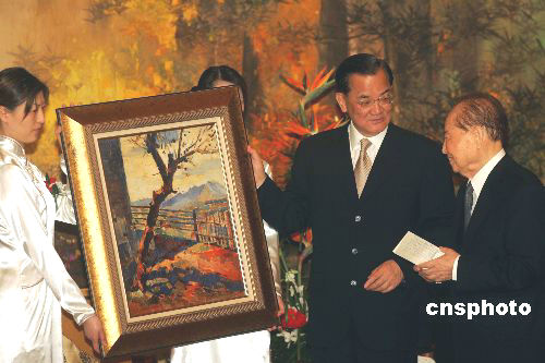 圖:連戰(zhàn)向汪道涵轉(zhuǎn)交辜振甫當(dāng)年的畫作