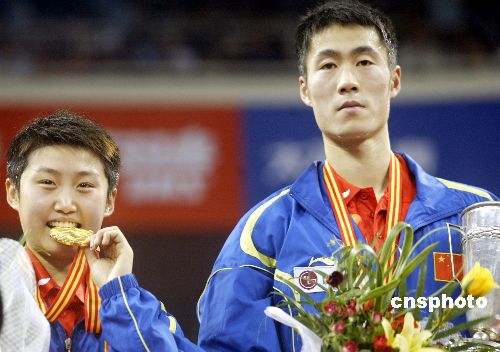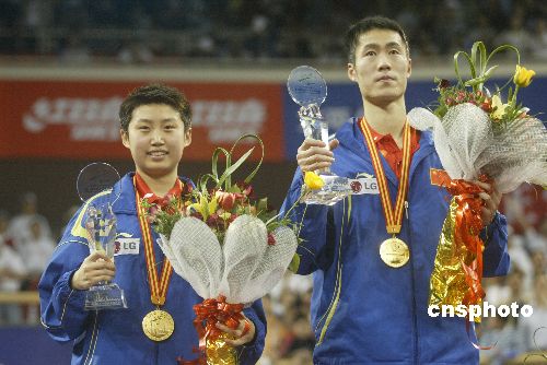 第四十八屆世界乒乓球錦標(biāo)賽混合雙打的比賽五月四日晚在上海體育館進(jìn)行,中國(guó)選手包攬了前三名,王勵(lì)勤、郭躍奪得冠軍。作者:盛佳鵬