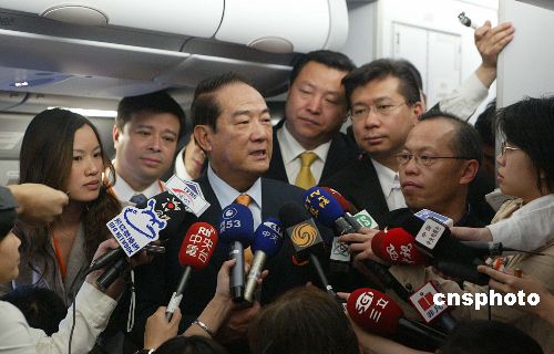 圖:宋楚瑜在飛機(jī)上回答記者提問(wèn)