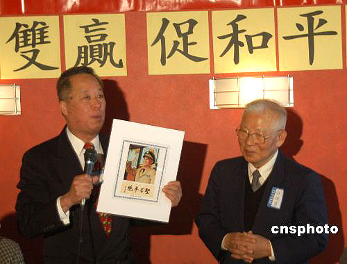 當?shù)貢r間五月七日,華盛頓“榮光會”會長李昌緒(左)向臺灣“新同盟會”會長許歷農(右)贈送照片。許歷農曾經擔任國民黨軍隊高級將領,幾年前因不滿李登輝而退出國民黨的許歷農最近又回到國民黨。作者:余東暉