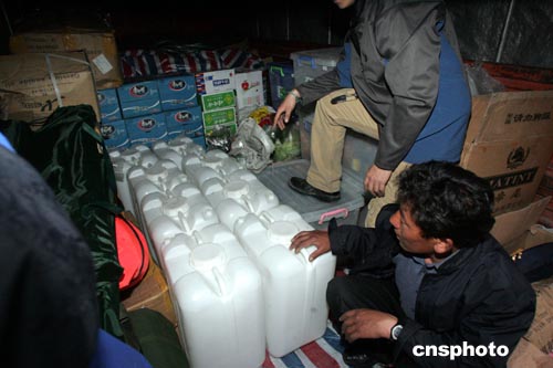 二零零五年五月五日,穿越可可西里聯(lián)想鋒行探險(xiǎn)隊(duì)車隊(duì)抵達(dá)拉薩,進(jìn)行休整,為挺進(jìn)可可西里作最后的準(zhǔn)備。下圖為隊(duì)員把大桶盛裝飲用水入車裝入八噸重的大卡車。