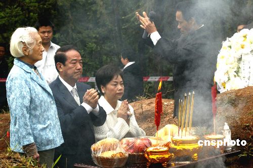 十時三十分許,按照故鄉(xiāng)世代相襲的習俗,祭拜由地方主祭人主持,宋楚瑜在曾祖父墓前鞠躬、上香、敬酒、獻果、叩拜、獻花圈。宋楚瑜代表多年前遠離故土的宋家人誦讀著祭文:赫赫先靈,衍脈隆興,三湘延慶,禹宇昌榮……沒有祭樂,空靈的山頭在聆聽著這位游子對故土、故人的幾許深情。字字句句,情真意切。此情此景讓已是鶴顏白發(fā)的宋母和“湘潭媳婦”夫人陳萬水潸然淚下,情不能已。
