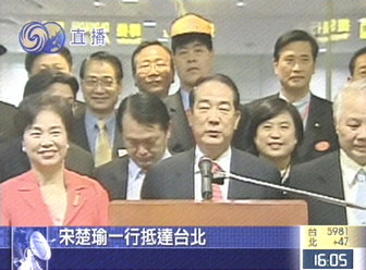 中新網(wǎng)5月13日電 親民黨主席宋楚瑜率親民黨大陸訪問(wèn)團(tuán)結(jié)束9天大陸訪問(wèn)行程,今天下午三點(diǎn)四十分左右乘長(zhǎng)榮航空航班抵達(dá)臺(tái)北。臺(tái)北市長(zhǎng)馬英九等到機(jī)場(chǎng)迎接。