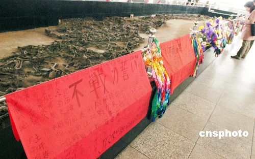 日本侵略者這種滅絕人性的殺戮行徑,令人神共憤,不僅讓中國人民刻骨銘心,也讓世界和平與正義人士義憤填膺。在“平頂山慘案紀念館”內(nèi),記者看到了許許多多來自日本的千紙鶴懸掛在遇難者遺骸的四周,這是日本“東日本鐵路工會代表團”等等那些日本和平正義人士敬獻給這些無辜遇難者冤魂的!捌巾斏綉K案紀念館”館長肖景全告訴記者,“平頂山慘案”遺址自上世紀七十年代開挖以來便不斷有日本游客前來參觀。三十多年來,已有數(shù)十萬人次日本人到撫順參觀“平頂山慘案”遺址紀念館。每一位目睹“慘案遺址”的參觀者,面對累累白骨,無不為當年日軍的殘暴所震驚。(完)