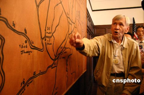 在史迪威將軍博物館里,愛德華老人在史迪威將軍昔日的軍事會(huì)議廳里,面對(duì)一九四四年繪制的“史迪威公路全圖”,他清楚地描述著當(dāng)年駝峰飛行的路線。