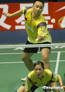 雅典奧運(yùn)冠軍張軍/高崚率先登場(chǎng),迎戰(zhàn)韓國(guó)強(qiáng)力搭檔李在珍/李孝珍。中國(guó)組合開(kāi)局階段忌憚李在珍的強(qiáng)力殺球,回球過(guò)于集中在網(wǎng)前,身材高大的李孝珍網(wǎng)前如魚(yú)得水,攻擊連連得手。在四比十一落后的困境中,中國(guó)球員調(diào)整戰(zhàn)術(shù),加強(qiáng)球路變化,搶回場(chǎng)上主動(dòng)權(quán),一口氣連奪十一分,先勝一局。易地再戰(zhàn),中國(guó)球員故態(tài)復(fù)萌,再度陷入被動(dòng),中局他們雖一度占據(jù)場(chǎng)上優(yōu)勢(shì),但最后階段莫名其妙的失誤使他們以十一比十五輸?shù)粢痪。決勝局,中國(guó)球員發(fā)揮比較穩(wěn)定,比分一路領(lǐng)先,以十五比八為中國(guó)隊(duì)打響頭炮。
