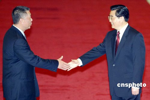 五月十六日晚,二○○五北京《財富》全球論壇在北京人民大會堂開幕。中國國家主席胡錦濤在開幕式前會見參會的VIP嘉賓。圖為會見時胡錦濤與澳門特區(qū)行政長官何厚鏵握手。作者:廖文靜