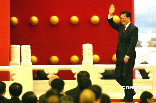 五月十六日晚,二○○五北京《財(cái)富》全球論壇在北京人民大會(huì)堂開幕,中國國家主席胡錦濤出席開幕式并作主題演講。作者:廖文靜