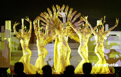 五月十六日晚,二○○五北京《財(cái)富》全球論壇在北京人民大會(huì)堂開(kāi)幕,由聾啞人表演的舞蹈“千手觀音”贏得現(xiàn)場(chǎng)掌聲不斷。作者:廖文靜
