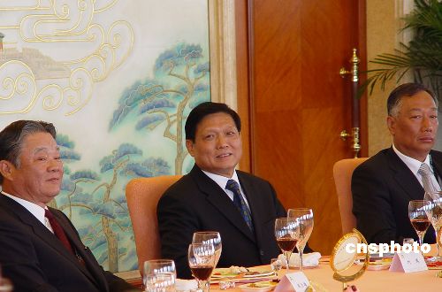 五月十七日,中共中央政治局委員、北京市委書(shū)記劉淇(圖中)在北京飯店會(huì)見(jiàn)并宴請(qǐng)出席《財(cái)富》論壇的臺(tái)灣工業(yè)總會(huì)理事長(zhǎng)侯貞雄(圖左)、鴻海集團(tuán)董事長(zhǎng)郭臺(tái)銘(圖右)等二十位臺(tái)灣知名企業(yè)家。作者:劉舒凌