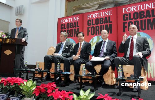 2005北京《財(cái)富》全球論壇5月18日專門舉行“中國(guó)銀行業(yè)改革近況”會(huì)議,中國(guó)銀監(jiān)會(huì)主席劉明康(左三)、國(guó)家開(kāi)發(fā)銀行行長(zhǎng)陳元(右二)用嫻熟的英語(yǔ)坦誠(chéng)地與麥肯錫公司亞洲區(qū)董事長(zhǎng)鮑達(dá)民(左二)、安永會(huì)計(jì)師事務(wù)所合伙人羅德曼(右一)等人對(duì)話。作者:任晨鳴