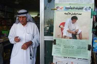 在巴格達(dá)的咖啡店,伊拉克人正在觀看一些阿拉伯衛(wèi)星電視臺(tái)播放《太陽報(bào)》頭版刊登的照片,其中一張就是薩達(dá)姆只穿內(nèi)褲站著的照片!短枅(bào)》還刊登著薩達(dá)姆在洗衣服、睡覺以及在獄中踱步等鏡頭。