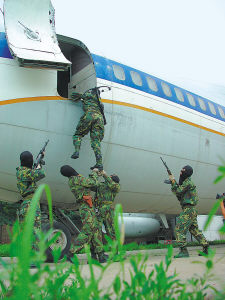 “攔住大巴,營救人質(zhì)!”我特戰(zhàn)隊員奉命緊急出動,在101國道設(shè)卡攔截。警車橫在馬路一側(cè),路面布上了阻車釘。不一會兒,大巴開過來了!巴\!”特戰(zhàn)隊指揮員手持擴音器喊話,勸“歹徒”懸崖勒馬。其他隊員分散在兩側(cè),準備出擊。