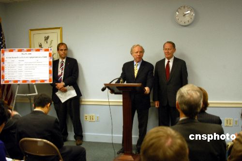 | 美國參議員喬.利伯曼(講話者)和拉馬爾.亞歷山大(前右一)二十五日聯(lián)合提出一項議案,要求美國聯(lián)邦政府從二00六年到二0一一年的五個財政年度內(nèi)撥款十三億美元,全面促進(jìn)美中在教育、學(xué)術(shù)、商業(yè)等方面的交流與接觸,并在美國中小學(xué)加強(qiáng)中文教育。作者:余東暉