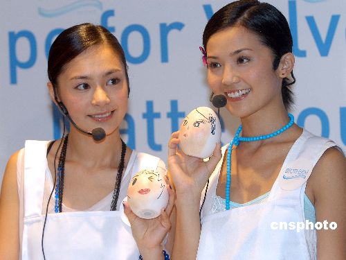 人氣偶像Twins 5月31日在香港出席代言化妝品牌BIOTHERM宣傳活動(dòng),Twins在活動(dòng)上模擬在人的蛋臉上示范使用全新粉底,再畫上可愛(ài)的人像,以宣傳品牌新產(chǎn)品。作者:鄧慶樂(lè)