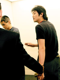 當(dāng)記者問他為什么近期很少露面,他顯得無所謂地回答:“最近沒戲拍唄,而且我腳受傷了,一直在養(yǎng)傷!庇浾哂謫査醴仆诵莸南⑹遣皇钦娴,是否與他有關(guān),李亞鵬嘴里立刻發(fā)出一連串表示無奈和煩躁的噓聲,說:“我……從來不回答這種杜撰的東西,就這樣!比缓蟮艮D(zhuǎn)身準(zhǔn)備不再配合鏡頭。剛好這時電梯來了,他立刻走進(jìn)電梯。電梯關(guān)門的一刻,李亞鵬才從容地向記者揮了揮手說:“謝謝你們,再見!(楊欣欣)