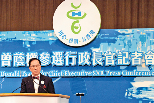 他透過面前密集的媒體大陣仗,向香港市民正式宣布參加中華人民共和國香港特別行政區(qū)行政長官選舉,同時(shí)公布他的施政綱領(lǐng)。