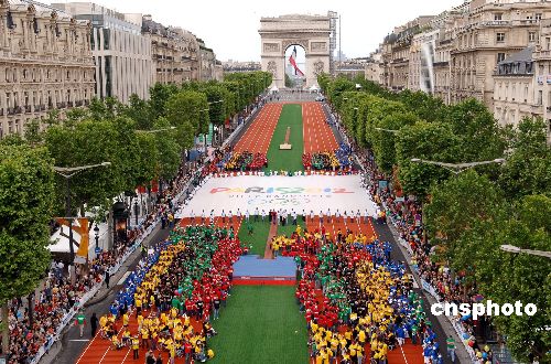6月5日,法國巴黎香榭麗舍大道被裝扮成巨型競技場,數(shù)萬巴黎人聚集于此,期盼巴黎申辦2012年夏季奧運會能夠成功。作者:Ic/cnsphoto