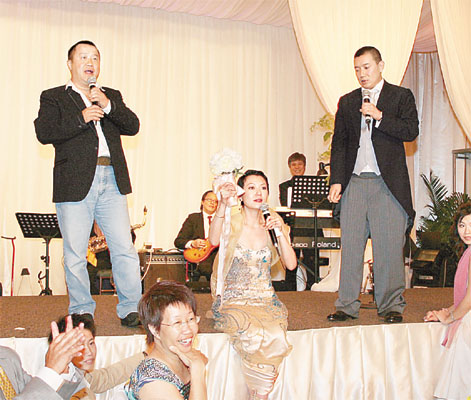 而此時千嬅在千呼萬喚下排眾而出,從新娘子手上接過花球,此時她已按捺不住,感動到眼濕濕。事后她手持花球笑容滿面對記者說:“是新娘指定我接!真是好驚人呀!今日是他們的大好日子,我順她意嘍!結婚是人生好大的承諾,又是阿澤的生日,只是太感動了。”至于會否盡快找真命天子,千嬅顯得煞有介事,并扯開話題:“不好意思,要宣傳新碟!彪m然舊愛鄭中基同場飲宴,卻不同桌,但被編得相當接近,二人沒有尷尬偶有傾談,但當嘉賓起哄叫他們上臺合唱時,二人立即充耳不聞。