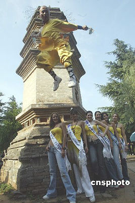 六月十二日,參加二○○五國(guó)際旅游小姐冠軍總決賽的來(lái)自七十五個(gè)國(guó)家和地區(qū)的旅游形象大使,齊聚河南省登封市著名的少林寺,繼續(xù)中國(guó)大陸之旅第二站河南巡游,少林寺內(nèi)的中國(guó)功夫表演吸引了來(lái)自各國(guó)的佳麗們。作者:盛佳鵬