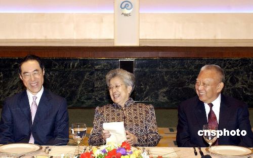 6月13日,國家副總理吳儀與全國政協(xié)副主席董建華(右)及香港署理行政長官唐英年(左)出席太平洋地區(qū)經(jīng)濟(jì)理事會(huì)開幕主題演講午餐宴會(huì)。作者:洪少葵