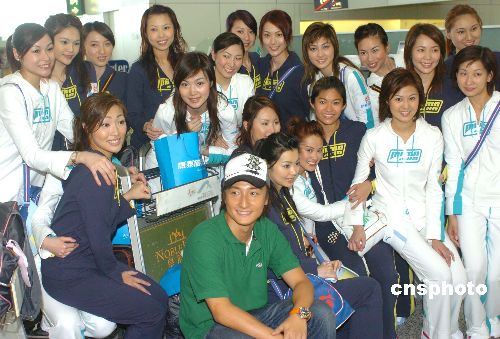 香港歌星方力申13日“率領(lǐng)”20位候選港姐乘坐斯里蘭卡航空公司航班奔赴馬爾代夫﹑斯里蘭卡﹑泰國(guó)拍攝外景﹐在香港機(jī)場(chǎng)與候選港姐合影。作者:趙振清