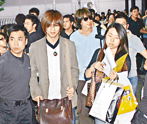 當(dāng)言、周二人出閘,fans欣喜若狂,場面一發(fā)不可收拾,三十多名保安、十多名警察嚴(yán)陣防亂,F(xiàn)場所見,明顯以言承旭fans的聲勢(shì)比周渝民強(qiáng)勁得多,難怪言承旭不時(shí)風(fēng)騷地向群眾揮手,反觀周渝民則頭耷耷,無厘神氣。最后二人在保安筑成人墻護(hù)送下登車離去。