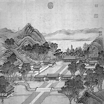 “圓明園四十景圖詠”是乾隆元年1736年,乾隆皇帝令宮廷畫師沈源、唐岱依據(jù)圓明園實景繪制,由沈源畫房舍,唐岱畫土山樹石。圓明園四十景,是指園內(nèi)獨成格局的四十處園林景觀,一個景就是一座“園中園”。當時圓明、長春、綺春,三園共計約有百余處景群,但昔日僅繪制此四十景,更突現(xiàn)出此四十景的顯要與華蓋群芳。四十景圖為絹本彩繪,每幅圖的絹心為64×65厘米,連裝池綾邊為83×75厘米,每幅圖配有時任工部尚書大書法家汪由敦代書的乾隆皇帝“四十景詩”,連同“四十景圖”共計四十對幅,每對幅為左詩右圖。