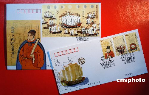 二00五年,中國(guó)政府隆重紀(jì)念明初中國(guó)航海家、和平史者鄭和率領(lǐng)萬(wàn)人船隊(duì)下西洋600周年。中國(guó)國(guó)務(wù)院特別批復(fù)了交通部倡議的七月十一日定為“航海日”。北京市郵票公司為配合國(guó)家郵政局于六月二十八日發(fā)行《鄭和下西洋600周年》紀(jì)念郵票(1套3枚),特設(shè)計(jì)、印制了該郵票的首日封(右)、小型張首日封(左)等精制郵品,并與郵票同日發(fā)行。作者:鄒憲