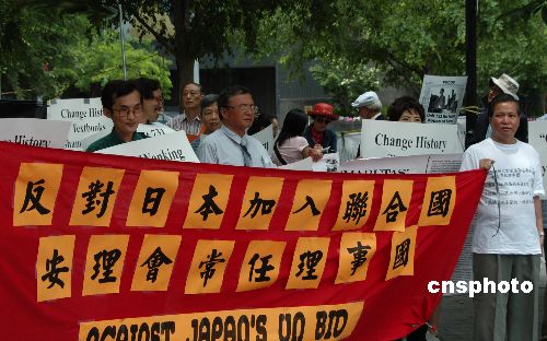 當(dāng)?shù)貢r(shí)間六月三十日中午,在紐約聯(lián)合國總部附近的哈瑪紹廣場,“世界抗日戰(zhàn)爭史實(shí)維護(hù)聯(lián)合會(huì)”舉行示威,反對日本加入安理會(huì)常任理事國。作者:譚宏偉