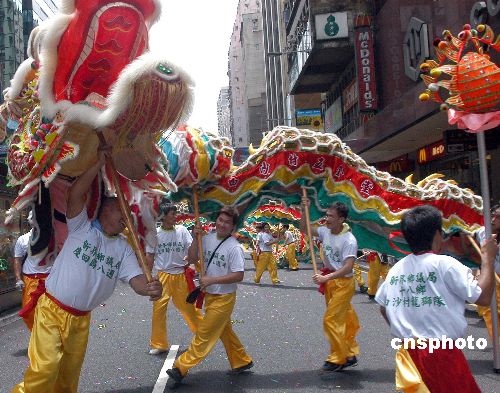 7月1日,為慶祝香港回歸八周年,由19個團體發(fā)起、超過800個團體合辦《慶;貧w八周年和諧團結(jié)創(chuàng)明天》大巡游,參與巡游的團體在鬧市表演舞金龍助慶。作者:鄧慶樂