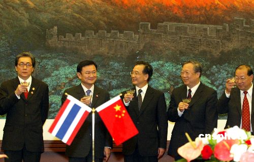 中新網(wǎng)7月1日電 據(jù)新華網(wǎng)報(bào)道,在中泰兩國(guó)建交30周年之際,10項(xiàng)雙邊經(jīng)貿(mào)合作協(xié)議于1日在北京簽署,項(xiàng)目?jī)?nèi)容涉及能源、礦產(chǎn)、食品、零售等多個(gè)領(lǐng)域。國(guó)務(wù)院副總理回良玉和泰國(guó)總理他信共同出席了簽字儀式。