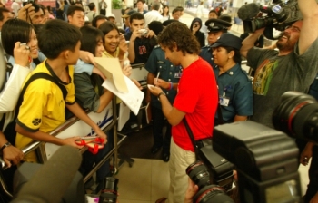 西班牙足球明星勞爾抵達新加坡,為該國的首都馬德里申辦奧運會助陣。圖為他給自己的球迷簽名。勞爾為西班牙國家隊和皇家馬德里隊的雙料隊長,也是馬德里市申奧的大使。