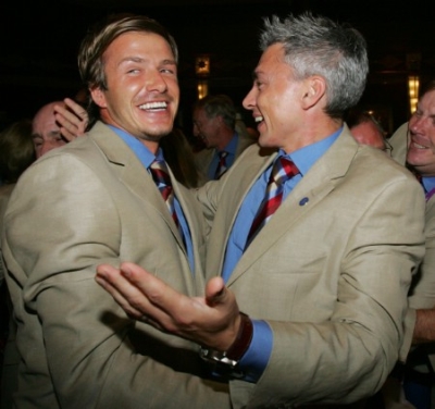 在得知倫敦申辦奧運會成功后,英格蘭隊隊長大衛(wèi)·貝克漢姆和奧運會金牌得知愛德華茲一起慶祝。經(jīng)過四輪的投票,倫敦在最后一輪中以54比50擊敗了巴黎,獲得奧運會的主辦權(quán)。圖據(jù)路透社