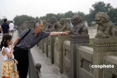 | 七月七日,一位花甲老人在昔日的抗日戰(zhàn)場——北京盧溝橋向?qū)O女介紹抗戰(zhàn)歷史。當(dāng)日“偉大勝利——紀(jì)念中國人民抗日戰(zhàn)爭暨世界反法西斯戰(zhàn)爭勝利六十周年大型主題展覽”在北京宛平城內(nèi)的中國人民抗日戰(zhàn)爭紀(jì)念館正式開展,城外盧溝橋,也迎來了不少緬懷抗日戰(zhàn)爭中英雄的市民。作者:盛佳鵬