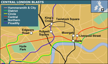12點56分,英國內(nèi)政部官員告訴下議院,“一些恐怖分子攻擊”了倫敦中部。其中包括至少四次的爆炸。其中三起發(fā)生在地鐵,一起發(fā)生在公共汽車。羅素廣場和國王十字車站、摩爾門(Moorgate),歐德門和利物浦大街車站(Aldgate and Liverpool Street Underground),愛德華爾路車站(Edgware Road station和發(fā)生巴士爆炸的達(dá)維斯托克廣場(Tavistock Square)。
