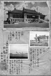 在一塊硬紙板上,這位日軍軍官特意將上海市市政府大樓被日軍轟炸前后作了比較。在被炸毀的上海市政府大樓照片中,還顯示出一塊寫有“上海神社建設(shè)地”的牌子。這幅照片的圖片說明注明當(dāng)時(shí)日軍有在上海市府前建靖國神社的企圖。在同一紙板后面,所貼的照片顯示了當(dāng)年上;疖囌颈徽У膽K狀。
