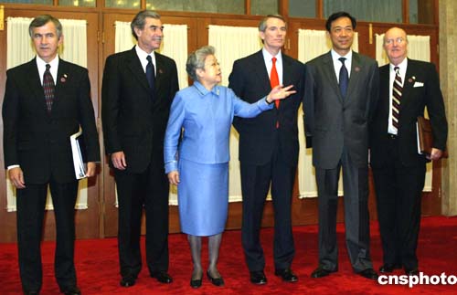 中國國務(wù)院副總理吳儀(左三)、中國商務(wù)部部長薄熙來(右二)與美國商務(wù)部長古鐵雷斯(左二)、美國貿(mào)易代表波特曼(右三)、美國農(nóng)業(yè)部長約翰斯(左一)、美國駐華大使雷德(右一)在會(huì)前合影。作者:廖文靜