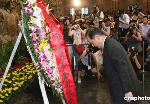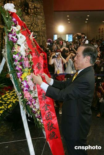 隨后郁慕明一行來到位于宛平城北側(cè)的“中國(guó)人民抗日戰(zhàn)爭(zhēng)紀(jì)念館”。在序廳里,郁慕明向抗日英烈們敬獻(xiàn)了花圈,并默哀致敬。隨后,訪問團(tuán)參觀了“偉大勝利——紀(jì)念中國(guó)人民抗日戰(zhàn)爭(zhēng)暨世界反法西斯戰(zhàn)爭(zhēng)勝利六十周年大型主題展覽”。展覽分民族危急救亡興起、國(guó)共合作共赴國(guó)難、中流砥柱抗戰(zhàn)燈塔等八個(gè)部分。記者注意到,郁慕明在國(guó)共合作共赴國(guó)難以及臺(tái)港澳同胞抗日部分逗留時(shí)間最長(zhǎng)。