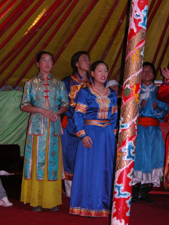 隨后,工作人員將把游客引領(lǐng)到傳統(tǒng)蒙古族居所——蒙古包內(nèi)。蒙古包內(nèi)的桌子上擺有蒙古族傳統(tǒng)食品,包括奶茶、黃油、奶豆腐等。在工作人員嘹亮蒙古族民歌歌聲與悠揚馬頭琴的伴奏下,游客可以盡情享用美食。