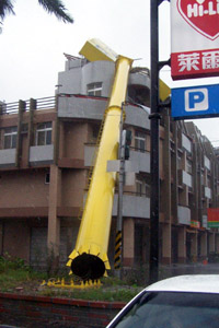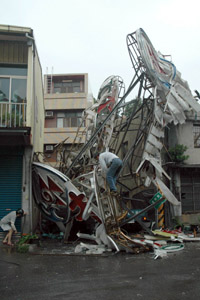 高雄縣橋頭鄉(xiāng)一座大型鐵制廣告廣告牌被強(qiáng)風(fēng)吹倒,壓到對面民宅。