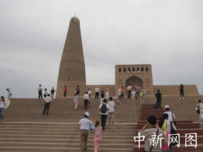 塔下的清真寺是一個大型清真寺,寬敞宏大。這是一個很有地方特色的建筑物。它有可容千人以上的禮拜大廳、穹形的拱頂,造型美觀的馬蹄形券頂,眾多的壁龕,幽暗的布道小室,處處都顯示著伊斯蘭建筑的風格和濃烈的宗教生活氣息。它們都是用陰干的生土坯建筑起來的。以陰干生土坯砌墻蓋頂,建屋造房,這在干燥少雨的吐魯番地區(qū)是十分普通而且有悠久歷史的建筑方法。保存至今的交河、高昌故城,隨處可見這種土坯建筑物。(摘自天山網)