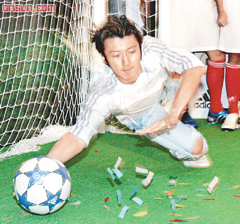 中新網(wǎng)7月19日電 據(jù)香港媒體報道,謝霆鋒昨日在灣仔出席某活動,同場還有將于本月底迎戰(zhàn)“紅魔”曼聯(lián)的港隊球員,雖然霆鋒手腳舊患仍未痊愈,但他仍到場做守門員,更不惜飛身擋截港隊球員的射球,背脊還撞向門柱,結果成功阻截港隊射球,表現(xiàn)相當賣力。
