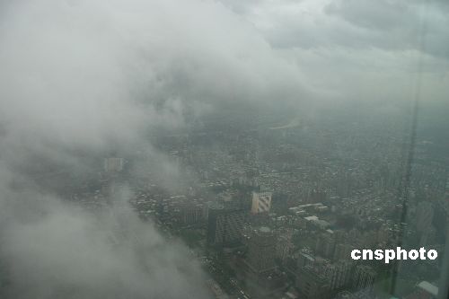 七月十九日,強臺風“海棠”的中心離開臺島,臺北市依然雨勢不停。圖為在臺北101大樓八十九層觀景臺(三百八十米高)拍攝到的臺北市容,陰云依舊籠罩臺北,能見度甚低。作者:董會峰