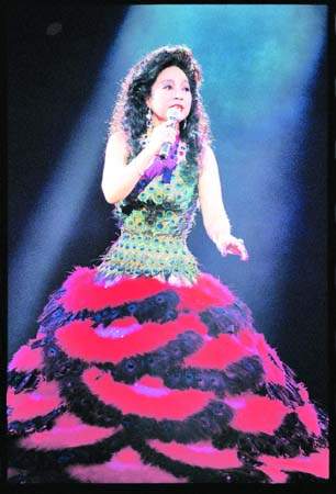 小鳳姐在演唱會上每每都以大型傘裙特顯其纖腰。這條用羽毛做成的大型傘裙,顏色鮮艷,纖纖細(xì)腰表露無遺。