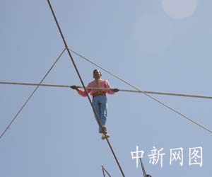 20日中午,16歲的男孩買合蘇正在20米高的空中表演達(dá)瓦孜,引發(fā)記者團(tuán)的陣陣掌聲。英吉沙縣正在建設(shè)一座達(dá)瓦孜學(xué)校,建成后將會(huì)招收全國各地的學(xué)員。