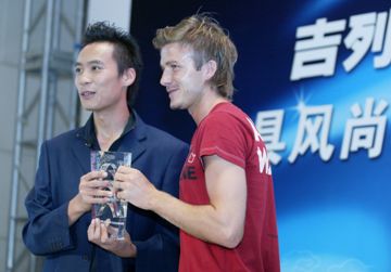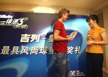 在他談到對(duì)“吉列-皇馬最具風(fēng)尚球迷評(píng)選”決賽的三個(gè)候選人的看法時(shí),他說:“如果你的球迷不僅僅能夠欣賞你踢球的動(dòng)作,也能夠理解你的個(gè)人風(fēng)尚,這對(duì)于一個(gè)球員來說真是太棒了!”之后他為由在場(chǎng)媒體評(píng)委選出的最具風(fēng)尚的球迷頒發(fā)了獎(jiǎng)杯。據(jù)悉此前貝克漢姆剛剛在“皇馬中國(guó)行”官方網(wǎng)站上舉行的“吉列-皇馬最具風(fēng)尚球星評(píng)選”中獲得了最具風(fēng)尚球星的稱號(hào),并且在中央電視臺(tái)的《天下足球豪門周-皇家馬德里專場(chǎng)》中接受了吉列公司市場(chǎng)總監(jiān)謝冰先生的頒獎(jiǎng),因此由他來給最具風(fēng)尚的球迷頒獎(jiǎng),顯然是順理成章。