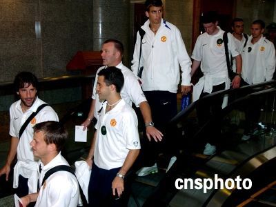 英超豪門曼聯(lián)隊(duì)昨日抵達(dá)北京,開始他們的中國之行。在未來的幾天中,他們將與中國的球迷以及媒體見面,并將與北京現(xiàn)代隊(duì)進(jìn)行一場友誼賽。圖為曼聯(lián)球星抵達(dá)北京,興致勃勃。