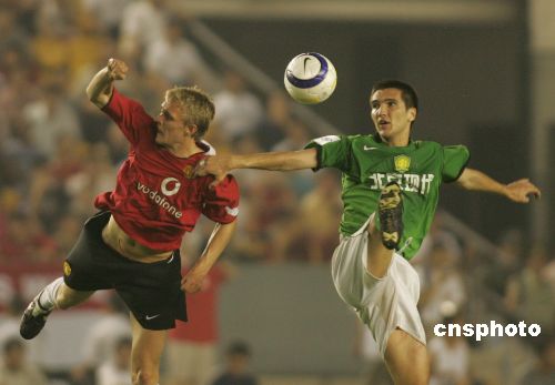在死守了近四十分鐘后,北京現(xiàn)代隊的后防線逐漸出現(xiàn)松懈的現(xiàn)象。曼聯(lián)隊中場大將斯科爾斯在上半場結束前五分鐘內頭頂腳踢接連攻入兩球,將上半場比賽的比分定格為二比零。